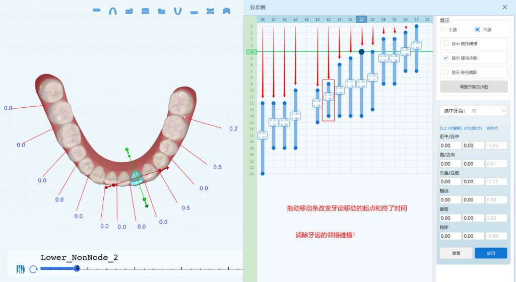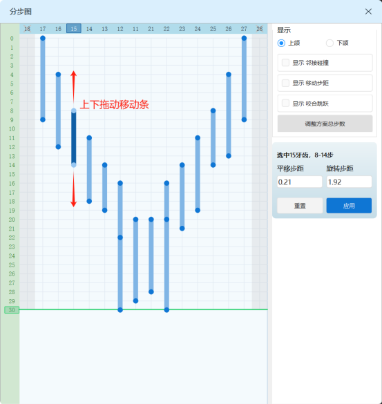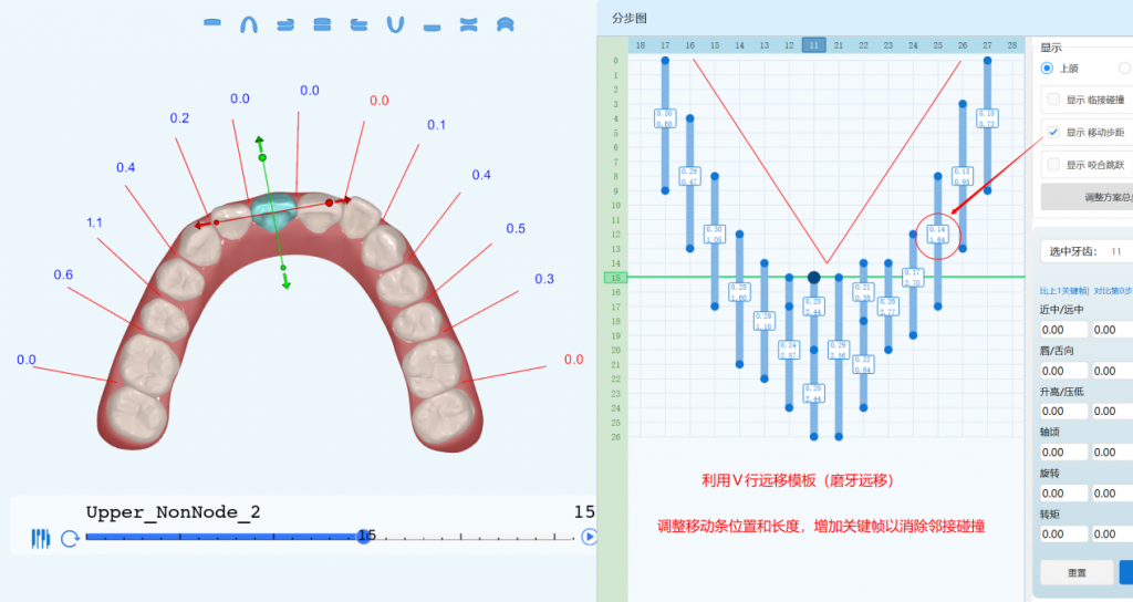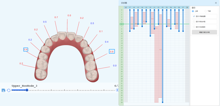 - 每颗牙齿的移动由单个或多个移动条控制,可视化调整单颗牙齿的移动顺序和速率