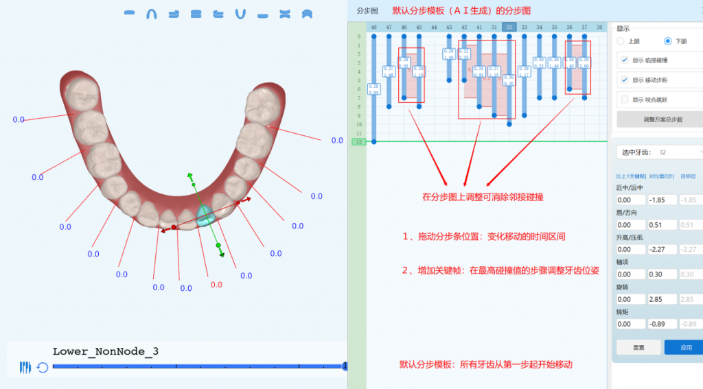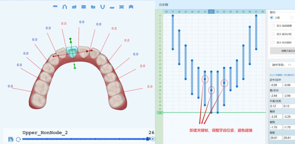 (2)激活关键帧,可改变单颗牙齿某一方向的移动量